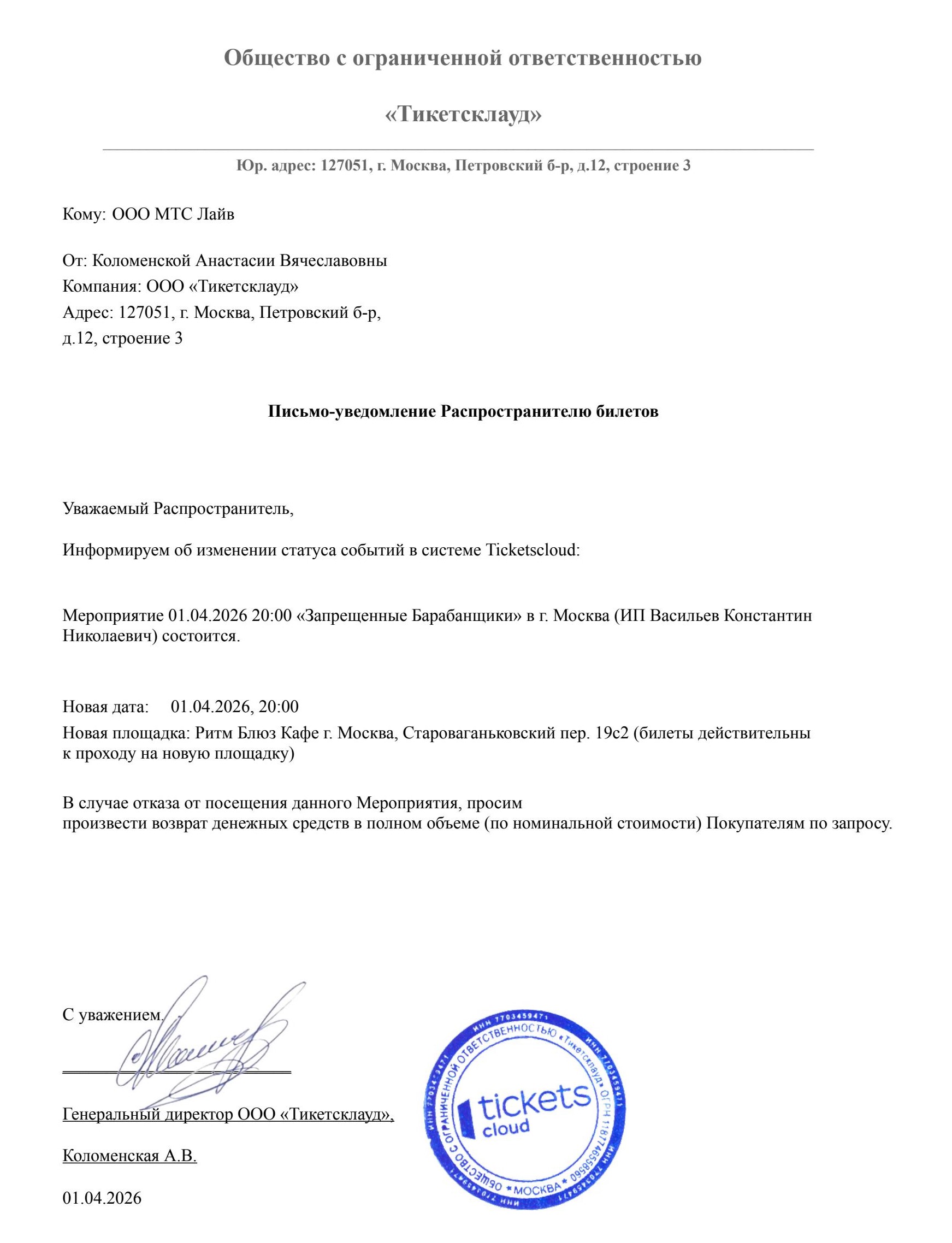 Уважаемый клиент! Спешим сообщить, что по информации, полученной от организатора, у концерта группы «Запрещенные Барабанщики», запланированном на 1 апреля 2026 года в 20:00 в клубе «16 Тонн Арбат», изменено место проведения. Новое место проведения концерта: Ритм Блюз Кафе (ст. м. Александровский сад, г. Москва, Староваганьковский переулок, 19 стр. 2). Ранее приобретенные билеты действительны на новую площадку, обменивать их не нужно. Если вам не удобно концерт на новой площадке, вы можете вернуть билет по кнопке в личном кабинете во вкладке «Заказы». Деньги за электронные билеты вернутся автоматически в полном объёме на карту, с которой была произведена оплата. Если вы купили билет в кассе Ticketland.ru за наличный расчет, то обратитесь, пожалуйста, на почту: vozvrat@ticketland.ru. С уважением, команда поддержки Ticketland.