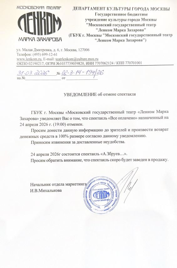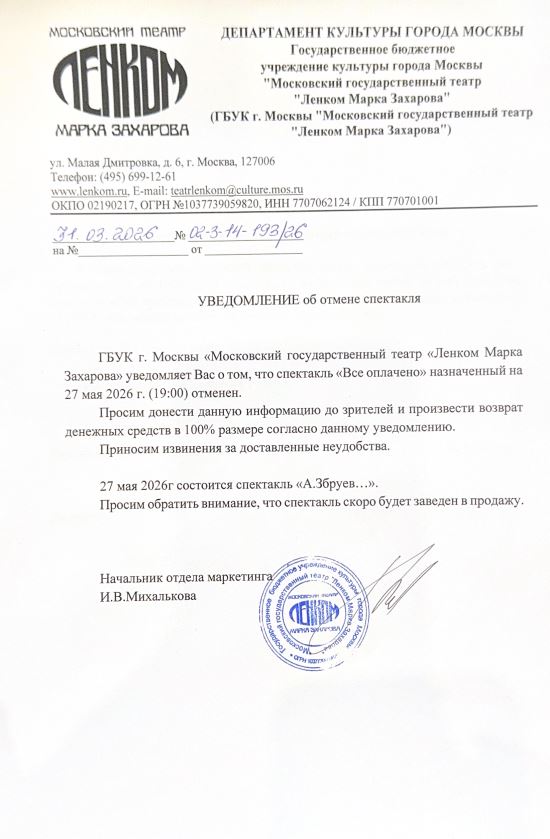 Уважаемый клиент! Спешим сообщить, что по информации, полученной от организатора, спектакль «Tout paye, или Всё оплачено», запланированный на 24 апреля и 27 мая 2026 года в 19:00 в театре «Ленком Марка Захарова», отменён. Деньги за электронные билеты вернутся автоматически в полном объёме на карту, с которой была произведена оплата. Если вы купили билет в кассе Ticketland.ru за наличный расчет или оплатили подарочной картой, то обратитесь, пожалуйста, на почту: vozvrat@ticketland.ru. С уважением, команда поддержки Ticketland.