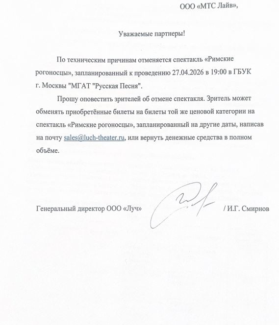 Уважаемый клиент! Спешим сообщить, что по информации, полученной от организатора, спектакль «Римские рогоносцы», запланированный на 27 апреля 2026 года в 19:00 в театре «Русская песня», отменён. Вы можете обменять приобретённые билеты на билеты той же ценовой категории на спектакль «Римские рогоносцы», запланированный на другие даты. По всем вопросам обращайтесь, пожалуйста, на электронную почту: sales@luch-theater.ru С уважением, команда поддержки Ticketland.
