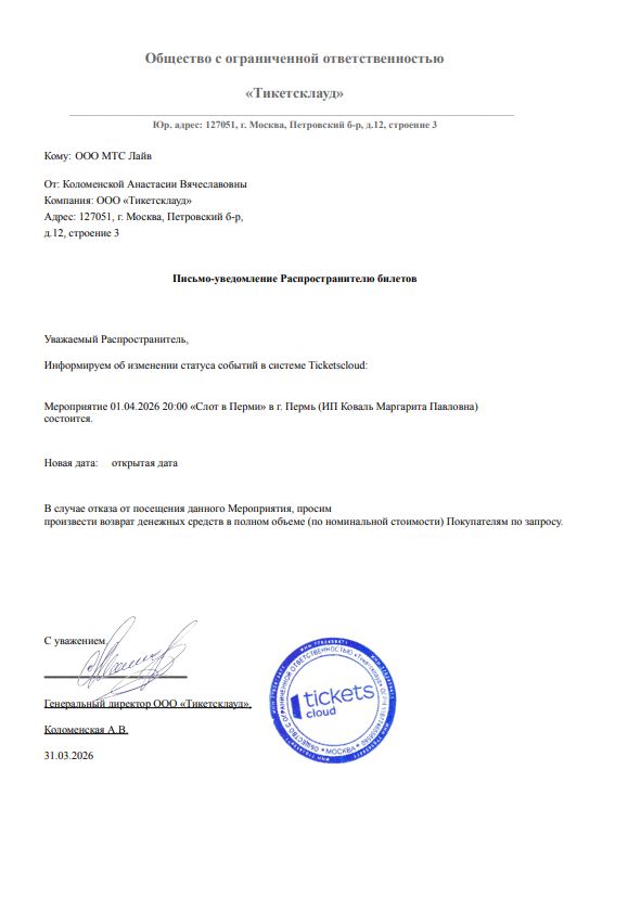Уважаемый клиент! Спешим сообщить, что по информации, полученной от организатора, концерт группы «Слот», запланированный на 1 апреля 2026 года в 20:00 в клубе «Свобода Concert Hall», перенесён на открытую дату. Новая дата концерта будет объявлена дополнительно. Ранее приобретенные билеты действительны на новую дату, обменивать их не нужно. Если вам не удобно посетить концерт в новую дату, вы можете вернуть билет по кнопке в личном кабинете во вкладке «Заказы» (до 31 мая 2026 года включительно). Деньги за электронные билеты вернутся автоматически в полном объёме на карту, с которой была произведена оплата. Если вы купили билет в кассе Ticketland.ru за наличный расчет или оплатили Подарочной картой, то обратитесь, пожалуйста, на почту: vozvrat@ticketland.ru. С уважением, команда поддержки Ticketland.