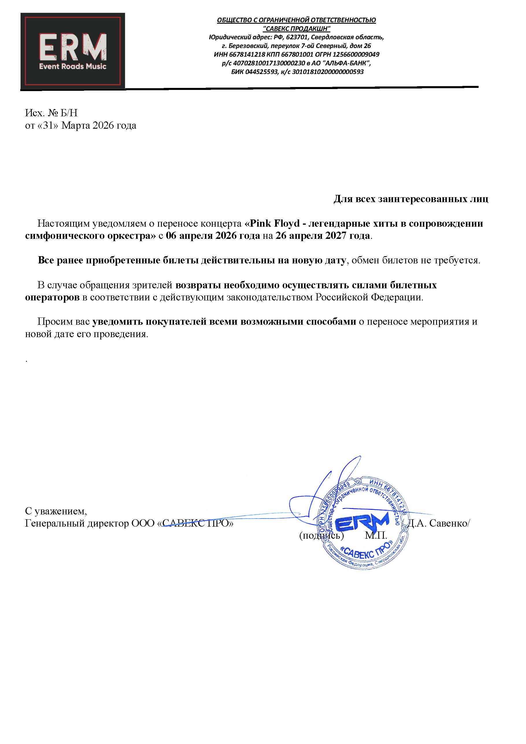Уважаемый клиент! Спешим сообщить, что по информации, полученной от организатора, концерт «Pink Floyd» — легендарные хиты в сопровождении симфонического оркестра», запланированный на 6 апреля 2026 года в 19:00 в Архангельском театре драмы им. М.В. Ломоносова, перенесён на 26 апреля 2026 года, начало в 19:00. Ранее приобретенные билеты действительны на новую дату, обменивать их не нужно. Если вам не удобно посетить концерт в новую дату, вы можете вернуть билет по кнопке в личном кабинете во вкладке «Заказы» (до 20 апреля 2026 года включительно). Деньги за электронные билеты вернутся автоматически в полном объёме на карту, с которой была произведена оплата. Если вы купили билет в кассе Ticketland.ru за наличный расчет или оплатили подарочной картой, то обратитесь, пожалуйста, на почту: vozvrat@ticketland.ru. С уважением, команда поддержки Ticketland.