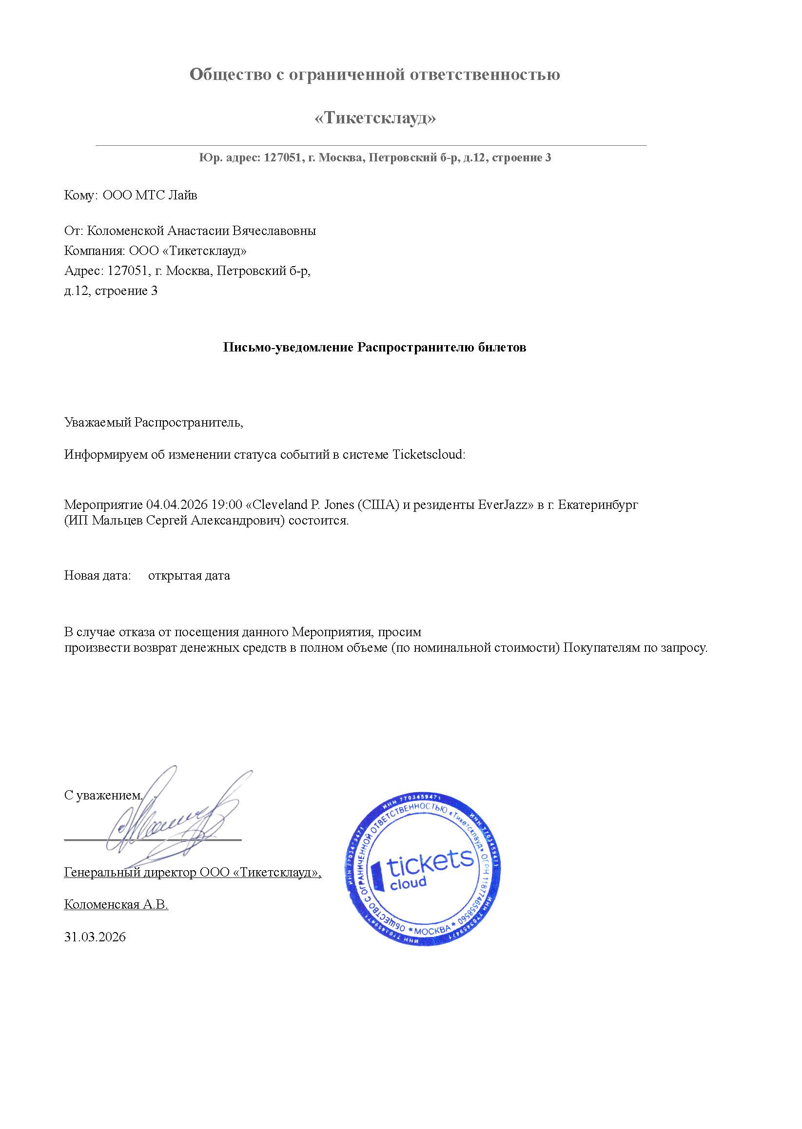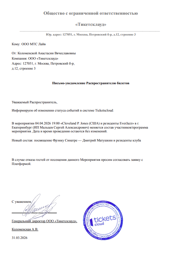Уважаемый клиент! Спешим сообщить, что по информации, полученной от организатора, концерт Cleveland P. Jones (США) и резиденты «EverJazz», запланированный на 4 апреля 2026 года в 19:00 в Джаз-клуб «EverJazz», перенесён на открытую дату. Новая дата концерта будет объявлена дополнительно. Ранее приобретенные билеты действительны на новую дату, обменивать их не нужно. Если вам не удобно посетить концерт в новую дату, вы можете вернуть билет по кнопке в личном кабинете во вкладке «Заказы» (до 31 мая 2026 года включительно). Деньги за электронные билеты вернутся автоматически в полном объёме на карту, с которой была произведена оплата. Если вы купили билет в кассе Ticketland.ru за наличный расчет или оплатили Подарочной картой, то обратитесь, пожалуйста, на почту: vozvrat@ticketland.ru. С уважением, команда поддержки Ticketland.