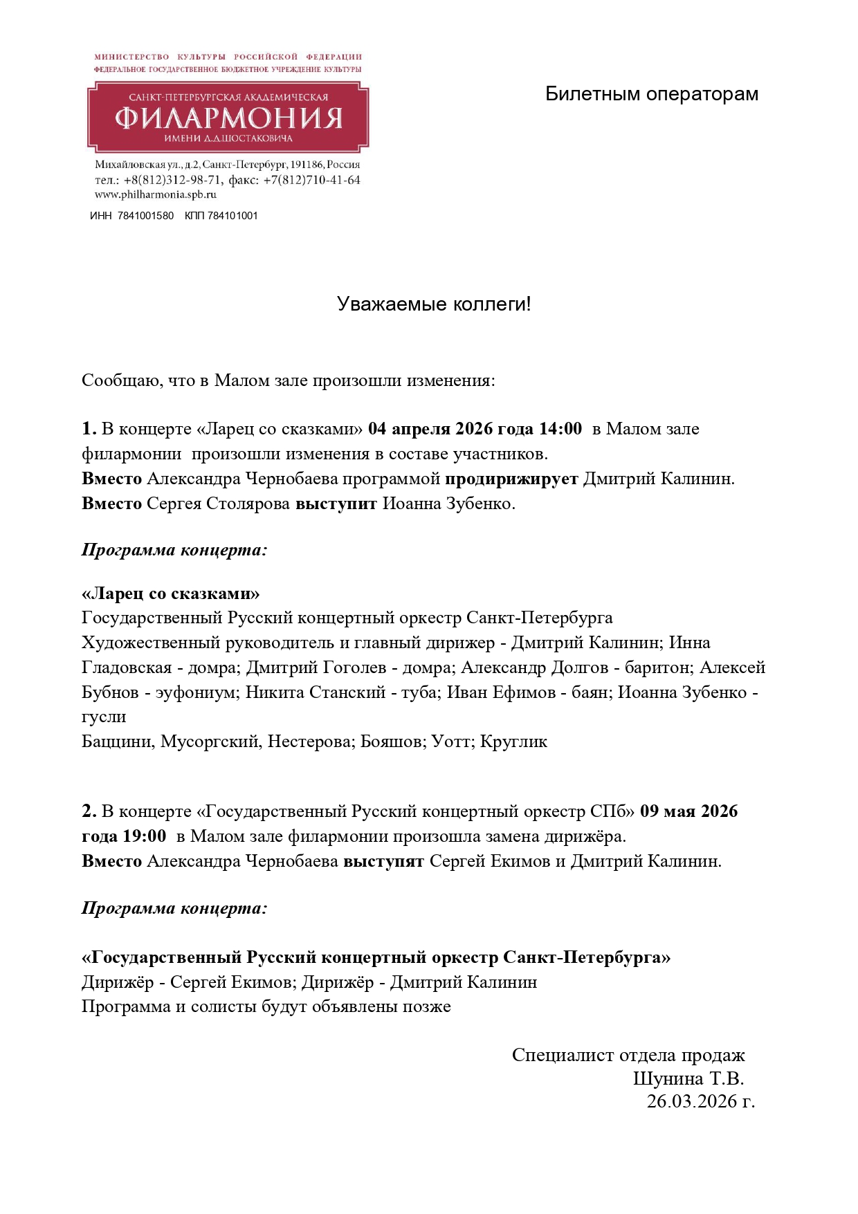 Уважаемый клиент! Спешим сообщить, что по информации, полученной от организатора, у концерта «Ларец со сказками» запланированного на 4 апреля 2026 года в 14:00 в филармонии, заменен дирижер, солист и программа мероприятия. Актуальную информацию о программе и выступающих можно посмотреть по ссылке. Ранее приобретенные билеты действительны, обменивать их не нужно. Если вы не хотите посетить новое мероприятие, вернуть билет можно по кнопке в личном кабинете во вкладке «Заказы». Деньги за электронные билеты вернутся автоматически в полном объёме на карту, с которой была произведена оплата. Если вы купили билет в кассе Ticketland.ru за наличный расчет или оплатили подарочной картой , то обратитесь, пожалуйста, на почту: vozvrat@ticketland.ru. С уважением, команда поддержки Ticketland