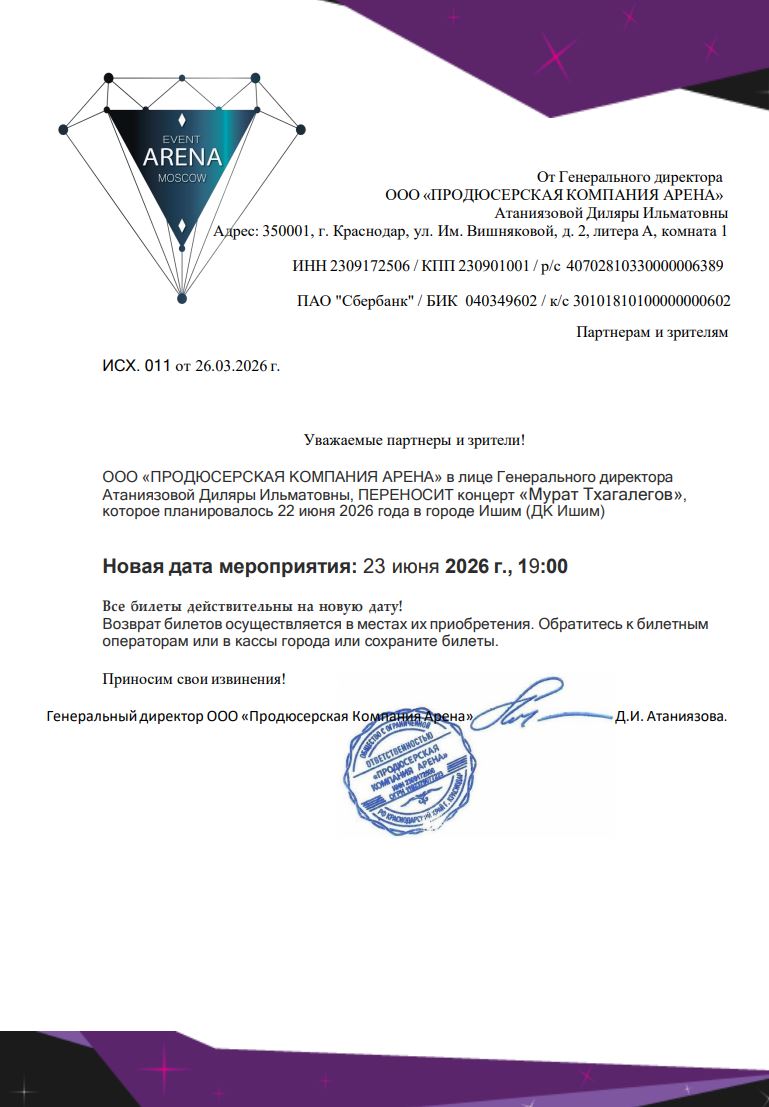 Уважаемый клиент! Спешим сообщить, что по информации, полученной от организатора, концерт Мурата Тхагалегова, запланированный на 22 июня 2026 года в ДК Ишим, переносится на 23 июня 2026 года. Ранее приобретенные билеты действительны на новую дату, обменивать их не нужно. Если вам не удобно посетить мероприятие в новую дату, вы можете вернуть билет по кнопке в личном кабинете во вкладке «Заказы». Деньги за электронные билеты вернутся автоматически в полном объёме на карту, с которой была произведена оплата. Если вы купили билет в кассе Ticketland.ru за наличный расчет, то обратитесь, пожалуйста, на почту: vozvrat@ticketland.ru. С уважением, команда поддержки Ticketland.