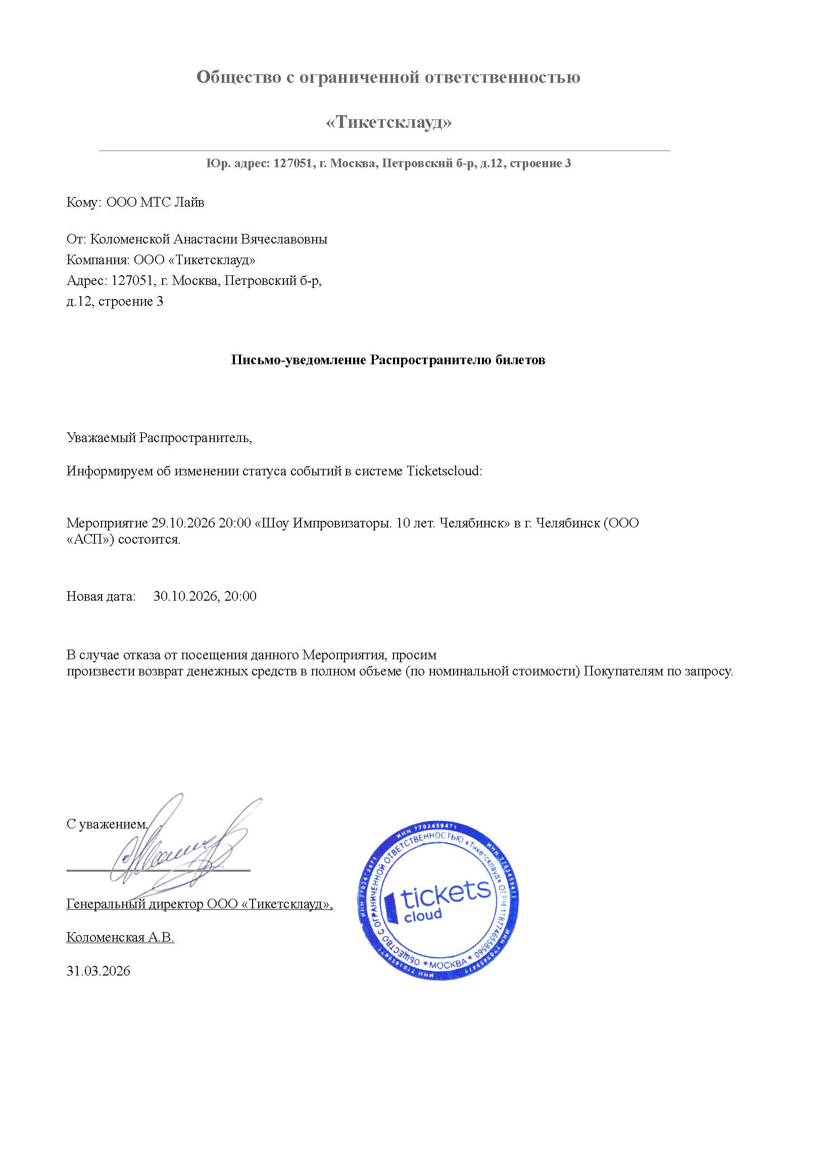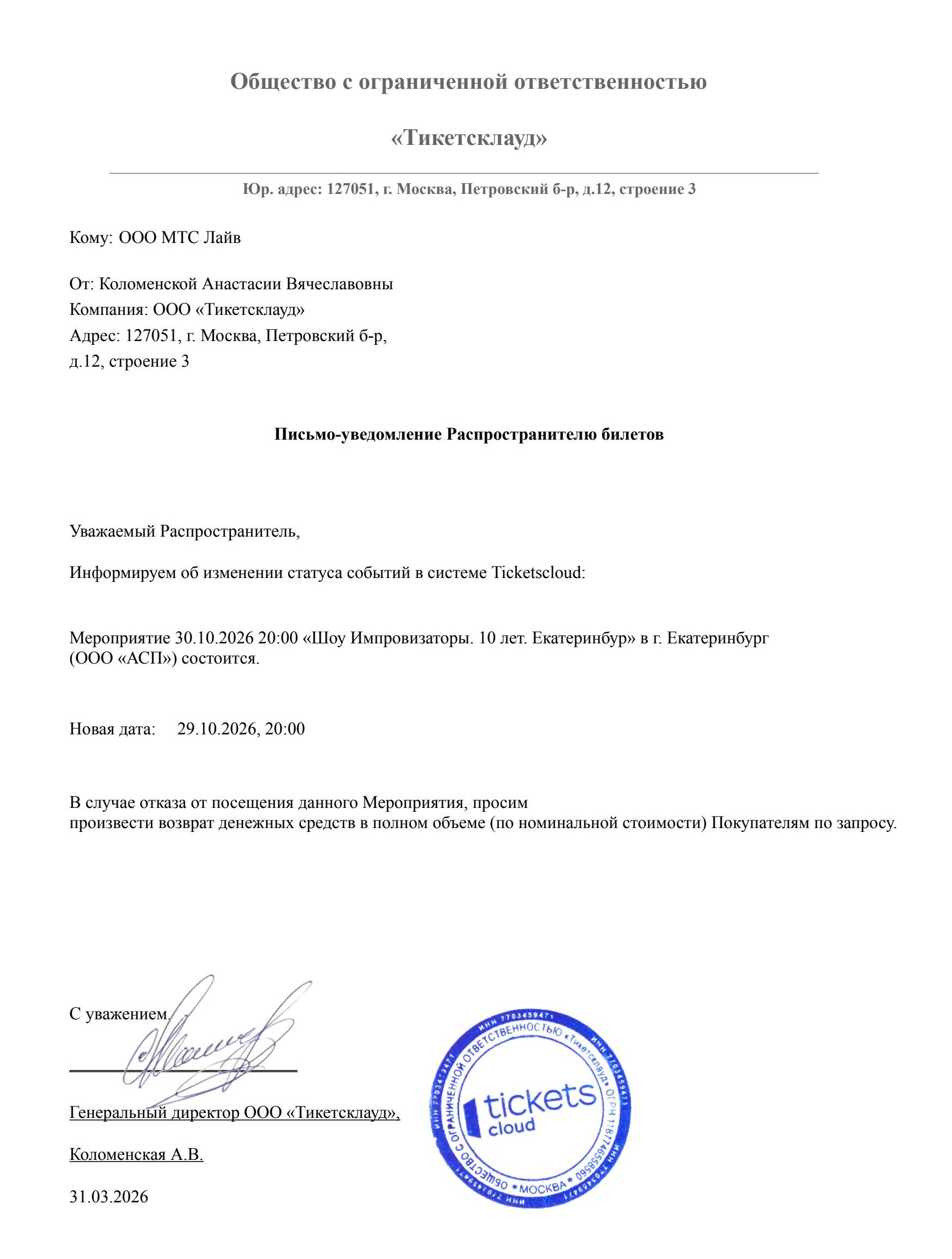 Уважаемый клиент! Спешим сообщить, что по информации, полученной от организатора, «Шоу Импровизаторы. 10 лет», запланированное на 30 октября 2026 года в 20:00 в МТС Live Холл, перенесено на 29 октября 2026 года, начало в 20:00. Ранее приобретенные билеты действительны на новую дату, обменивать их не нужно. Если вам не удобно посетить концерт в новую дату, вы можете вернуть билет по кнопке в личном кабинете во вкладке «Заказы» (до 29 октября 2026 года до 20:00). Деньги за электронные билеты вернутся автоматически в полном объёме на карту, с которой была произведена оплата. Если вы купили билет в кассе Ticketland.ru за наличный расчет или оплатили подарочной картой, то обратитесь, пожалуйста, на почту: vozvrat@ticketland.ru. С уважением, команда поддержки Ticketland.