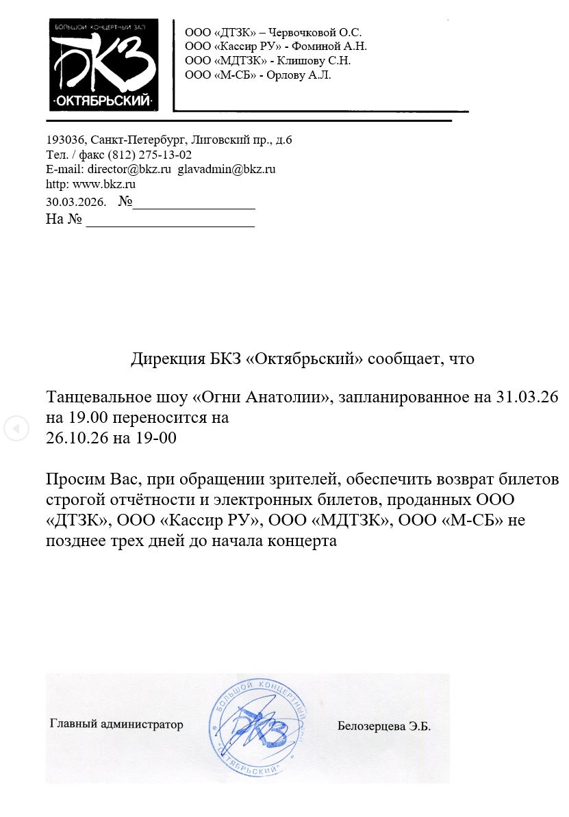 Уважаемый клиент! Спешим сообщить, что по информации, полученной от организатора, концерт «Огни Анатолии», запланированный на 31 марта 2026 года в 19:00 в БКЗ «Октябрьский», перенесён на 26 октября 2026 года, начало в 19:00. Ранее приобретенные билеты действительны на новую дату, обменивать их не нужно. Если вам не удобно посетить спектакль в новую дату, вы можете вернуть билет по кнопке в личном кабинете во вкладке «Заказы» (до 23 октября 2026 года) . Деньги за электронные билеты вернутся автоматически в полном объёме на карту, с которой была произведена оплата. Если вы купили билет в кассе Ticketland.ru за наличный расчет или оплатили подарочной картой, то обратитесь, пожалуйста, на почту: vozvrat@ticketland.ru. С уважением, команда поддержки Ticketland.
