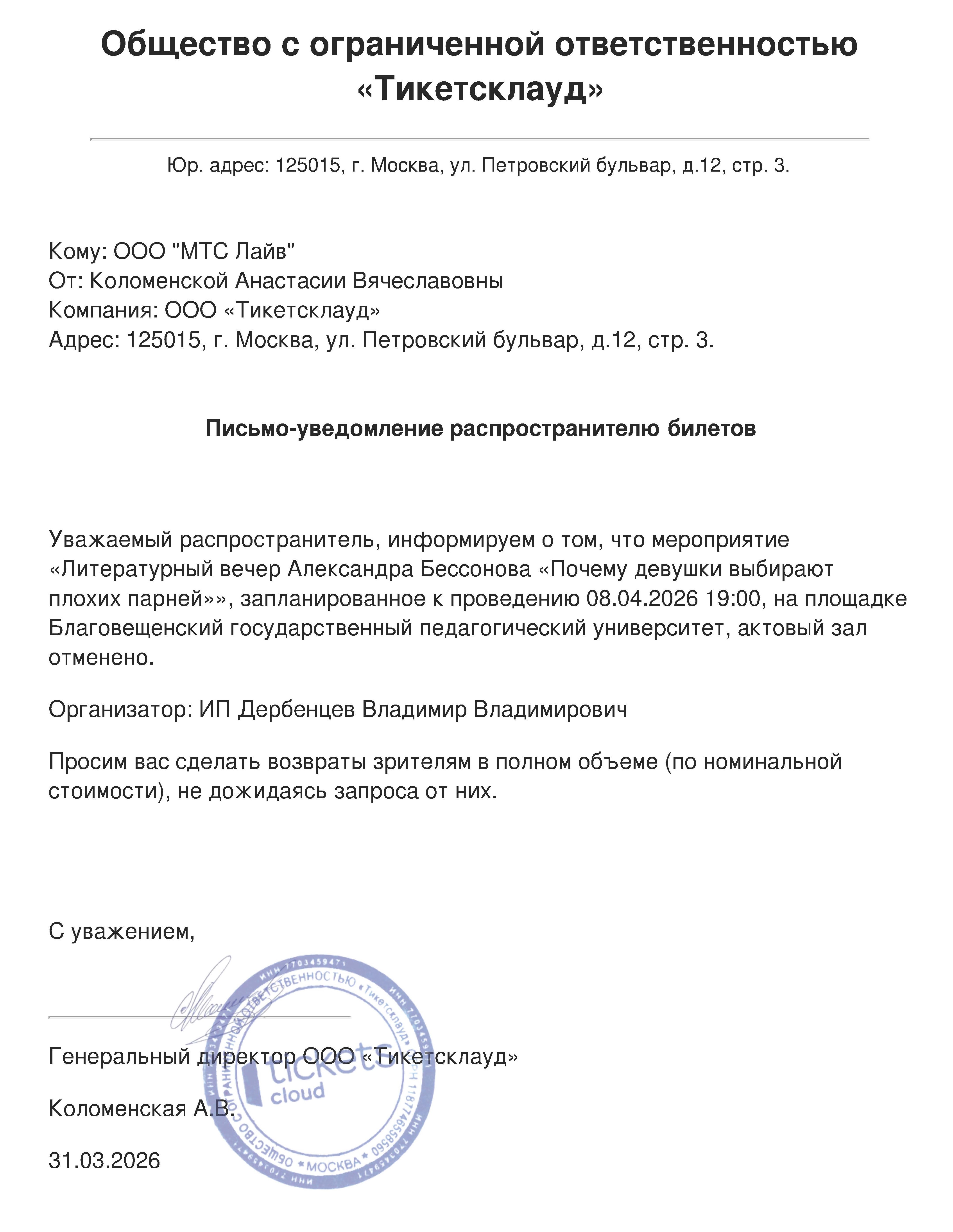 Уважаемый клиент! Спешим сообщить, что по информации, полученной от организатора, Литературный вечер Александра Бессонова «Почему девушки выбирают плохих парней», запланированный на 8 апреля 2026 года в 19:00 в Благовещенском государственном педагогическом университете, отменён. Деньги за электронные билеты вернутся автоматически в полном объёме на карту, с которой была произведена оплата. Если вы купили билет в кассе Ticketland.ru за наличный расчет или оплатили подарочной картой, то обратитесь, пожалуйста, на почту: vozvrat@ticketland.ru. С уважением, команда поддержки Ticketland.