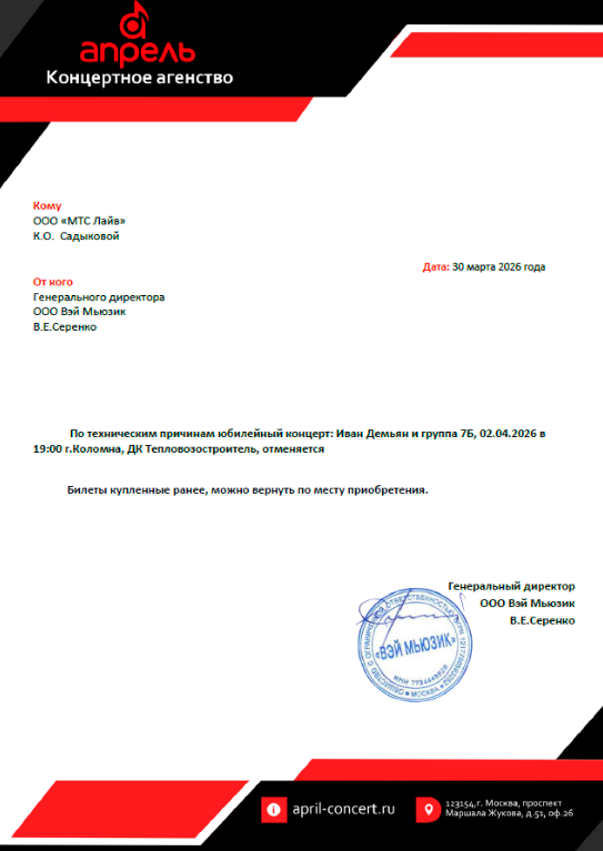 Уважаемый клиент! Спешим сообщить, что по информации, полученной от организатора, концерт «Мариам Мерабова. Латина в джазе», запланированный на 6 апреля 2025 года в 13:00 в Доме музыки, перенесен на 4 апреля 2026 года. Ранее приобретенные билеты действительны на новую дату, обменивать их не нужно. Если вам не удобно посетить мероприятие в новую дату, вы можете вернуть билет по кнопке в личном кабинете во вкладке «Заказы» (16 апреля 2025 г.). Деньги за электронные билеты вернутся автоматически в полном объёме на карту, с которой была произведена оплата. Если вы купили билет в кассе Ticketland.ru за наличный расчет, то обратитесь, пожалуйста, на почту: vozvrat@ticketland.ru. С уважением, команда поддержки Ticketland