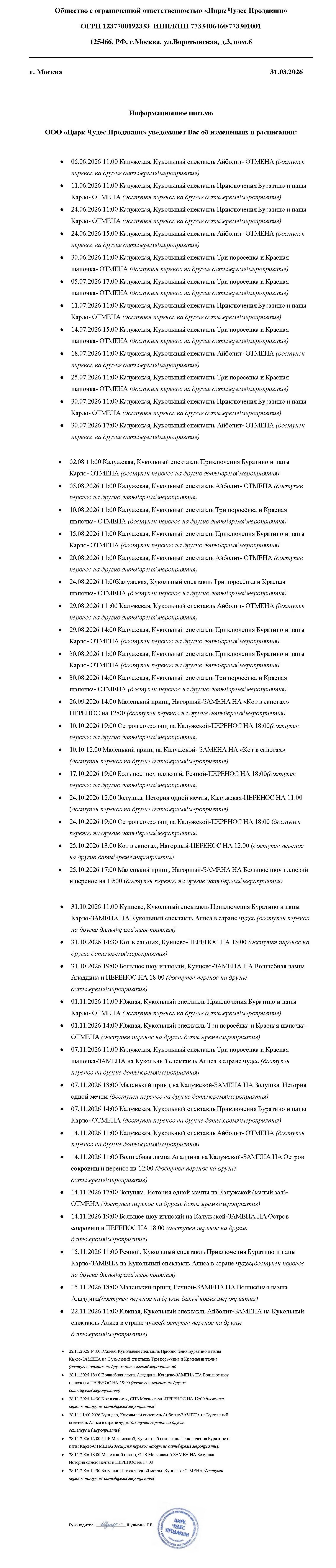 Уважаемый клиент! Спешим сообщить, что по информации, полученной от организатора, Большое шоу иллюзий, запланированное на 17 октября 2026 года в 19:00 в Цирке Чудес на речном (КЦ «Онежский»), перенесено на один час назад. Верное время начала шоу - в 18:00. Ранее приобретенные билеты действительны на новое время, обменивать их не нужно. По вопросам возвратов и обменов билетов обращайтесь пожалуйста, по номеру телефона: +7 (495) 445 49 45, или по электронной почте: office@aivengo-t.ru. С уважением, команда поддержки Ticketland.
