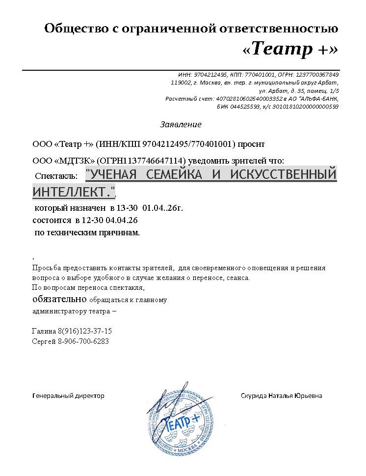 Уважаемый клиент! Спешим сообщить, что по информации, полученной от организатора, спектакль «Ученая семейка и Искусственный интеллект!», запланированный на 1 апреля 2026 года в 13:30 в театре Мира, перенесён на 4 апреля 2026 года, начало в 12:30. Ранее приобретенные билеты действительны на новую дату, обменивать их не нужно. По вопросам переноса спектакля обращайтесь, пожалуйста, к организатору по номерам телефонов: Галина +7 (916) 123-37-15 и Сергей +7 (906) 700-62-83. С уважением, команда поддержки Ticketland.