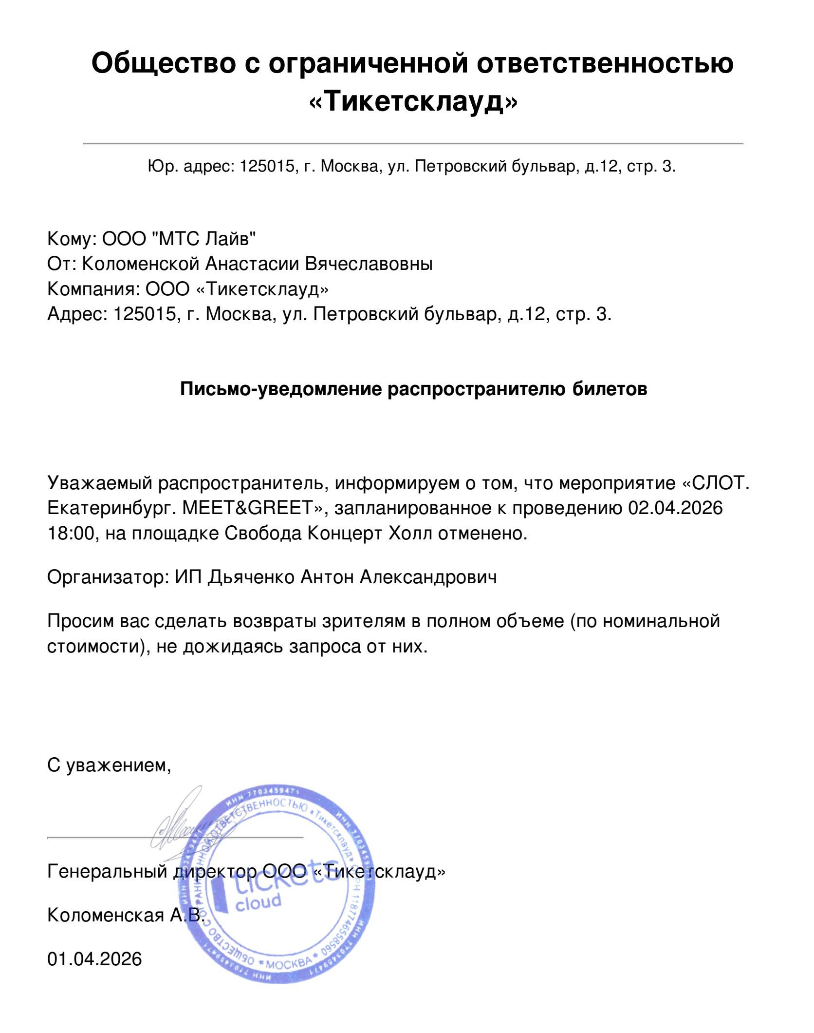 Уважаемый клиент! Спешим сообщить, что по информации, полученной от организатора, концерт группы «Слот» (Meet & Greet), запланированный на 2 апреля 2026 года в 18:00 в клубе «Свобода», отменён. Деньги за электронные билеты вернутся автоматически в полном объёме на карту, с которой была произведена оплата. Если вы купили билет в кассе Ticketland.ru за наличный расчет или оплатили подарочной картой, то обратитесь, пожалуйста, на почту: vozvrat@ticketland.ru. С уважением, команда поддержки Ticketland.