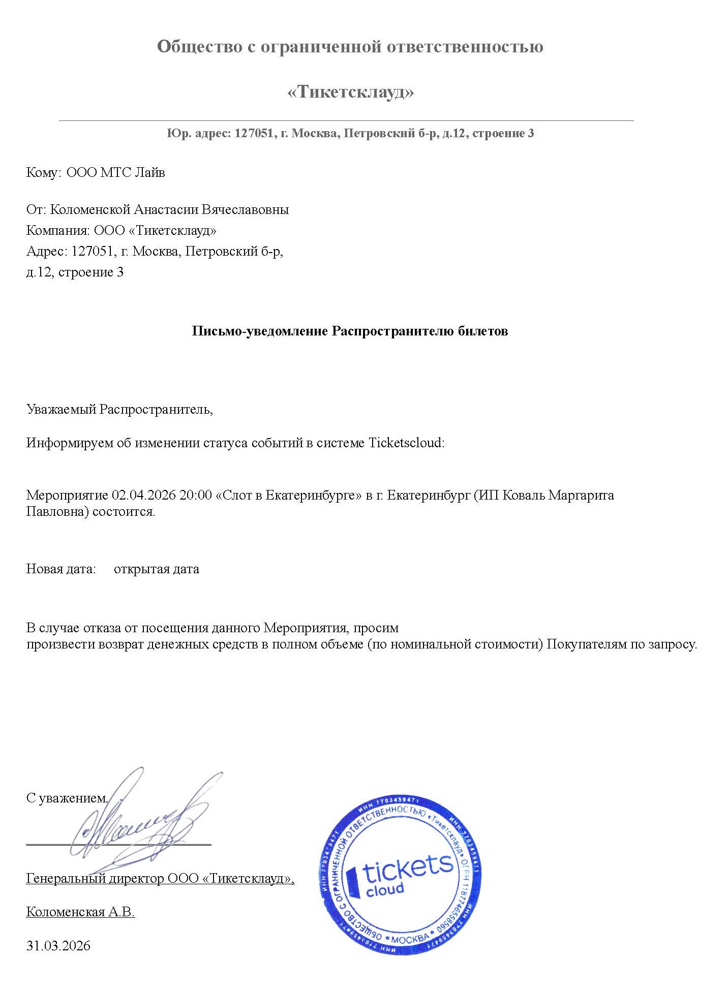 Уважаемый клиент! Спешим сообщить, что по информации, полученной от организатора, концерт Ирины Круг, запланированный на 2 августа 2025 года в 20:00 на площадке «МТС Live Лето», перенесён на открытую дату. Новая дата концерта будет объявлена дополнительно. Ранее приобретенные билеты действительны на новую дату, обменивать их не нужно. Если вам не удобно посетить мероприятие в новую дату, вы можете вернуть билет по кнопке в личном кабинете во вкладке «Заказы» (до 31 августа 2025 года включительно). Деньги за электронные билеты вернутся автоматически в полном объёме на карту, с которой была произведена оплата. Если вы купили билет в кассе Ticketland.ru за наличный расчет, то обратитесь, пожалуйста, на почту: vozvrat@ticketland.ru. С уважением, команда поддержки Ticketland.