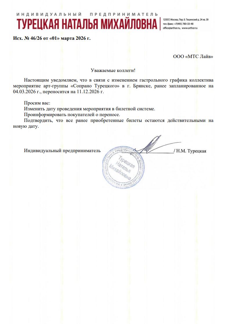Уважаемый клиент! Спешим сообщить, что по информации, полученной от организатора, концерт Сопрано Турецкого, запланированный на 4 марта 2026 года в 19:00 вДК БМЗ Брянск, перенесён на 11 декабря 2026 года, начало в 19:00. Ранее приобретенные билеты действительны на новую дату, обменивать их не нужно. Если вам не удобно посетить концерт в новую дату, вы можете вернуть билет по кнопке в личном кабинете во вкладке «Заказы». Деньги за электронные билеты вернутся автоматически в полном объёме на карту, с которой была произведена оплата. Если вы купили билет в кассе Ticketland.ru за наличный расчет или оплатили подарочной картой, то обратитесь, пожалуйста, на почту: vozvrat@ticketland.ru. С уважением, команда поддержки Ticketland.
