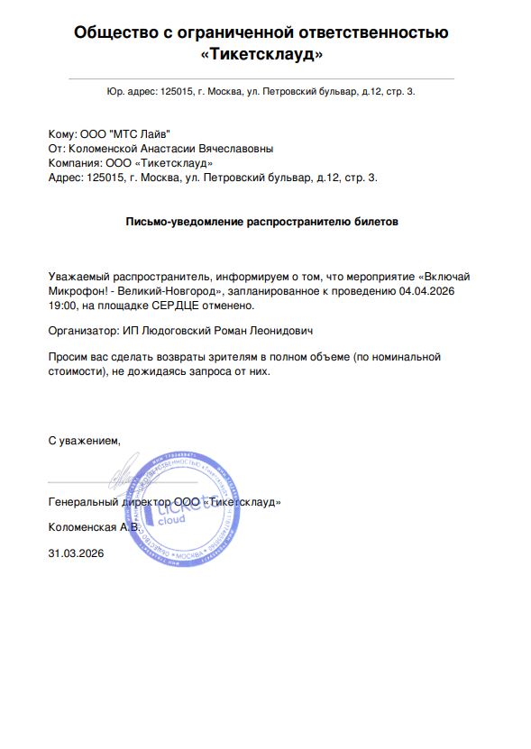 Уважаемый клиент! Спешим сообщить, что по информации, полученной от организатора, концерт «Включай Микрофон!», запланированный на 4 апреля 2026 года в 19:00 в клубе «Сердце», отменён. Деньги за электронные билеты вернутся автоматически в полном объёме на карту, с которой была произведена оплата. Если вы купили билет в кассе Ticketland.ru за наличный расчет или оплатили подарочной картой, то обратитесь, пожалуйста, на почту: vozvrat@ticketland.ru. С уважением, команда поддержки Ticketland.