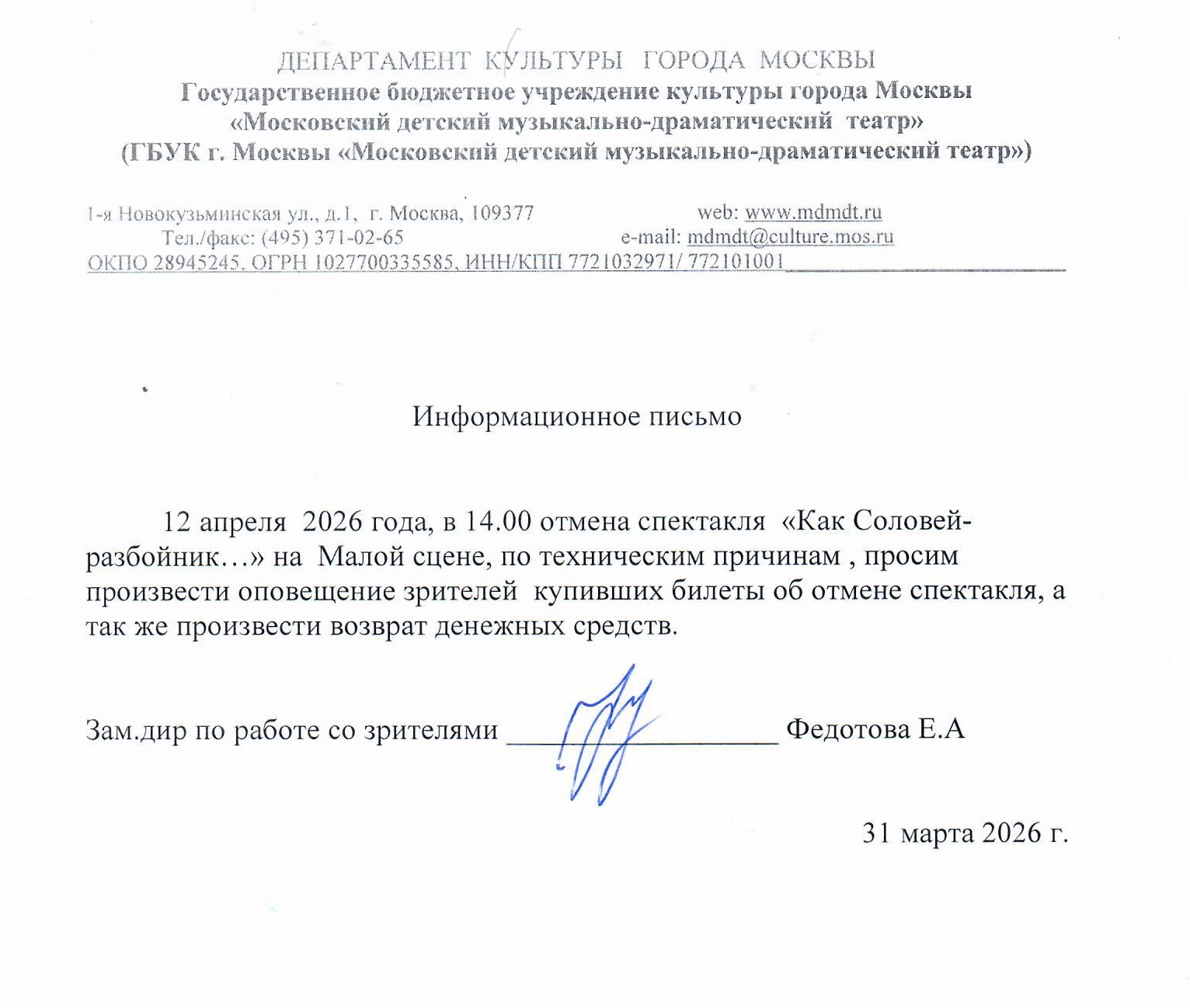 Уважаемый клиент! Спешим сообщить, что по информации, полученной от организатора, спектакль «Король Лир», запланированный на 31 марта 2026 года в 19:00 в Театре имени Евгения Вахтангова, перенесён на 30 июня 2026 года, начало в 19:00. Ранее приобретенные билеты действительны на новую дату, обменивать их не нужно. Если вам не удобно посетить спектакль в новую дату, вы можете вернуть билет по кнопке в личном кабинете во вкладке «Заказы» (до 10.04.2026 включительно). Деньги за электронные билеты вернутся автоматически в полном объёме на карту, с которой была произведена оплата. Если вы купили билет в кассе Ticketland.ru за наличный расчет или оплатили подарочной картой, то обратитесь, пожалуйста, на почту: vozvrat@ticketland.ru. С уважением, команда поддержки Ticketland.