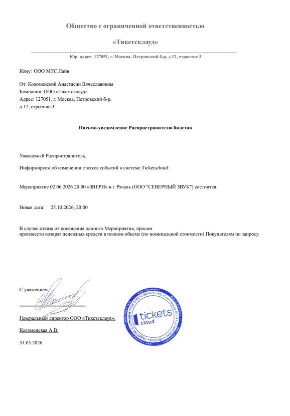 Уважаемый клиент! Спешим сообщить, что по информации, полученной от организатора, концерт группы «Звери», запланированный на 2 июня 2026 года в 20:00 в ДС «Олимпийский» (Рязань), перенесён на 25 октября 2026 года, начало в 20:00. Ранее приобретенные билеты действительны на новую дату, обменивать их не нужно. Если вам не удобно посетить концерт в новую дату, вы можете вернуть билет по кнопке в личном кабинете во вкладке «Заказы». Деньги за электронные билеты вернутся автоматически в полном объёме на карту, с которой была произведена оплата. Если вы купили билет в кассе Ticketland.ru за наличный расчет или оплатили Подарочной картой, то обратитесь, пожалуйста, на почту: vozvrat@ticketland.ru. С уважением, команда поддержки Ticketlan